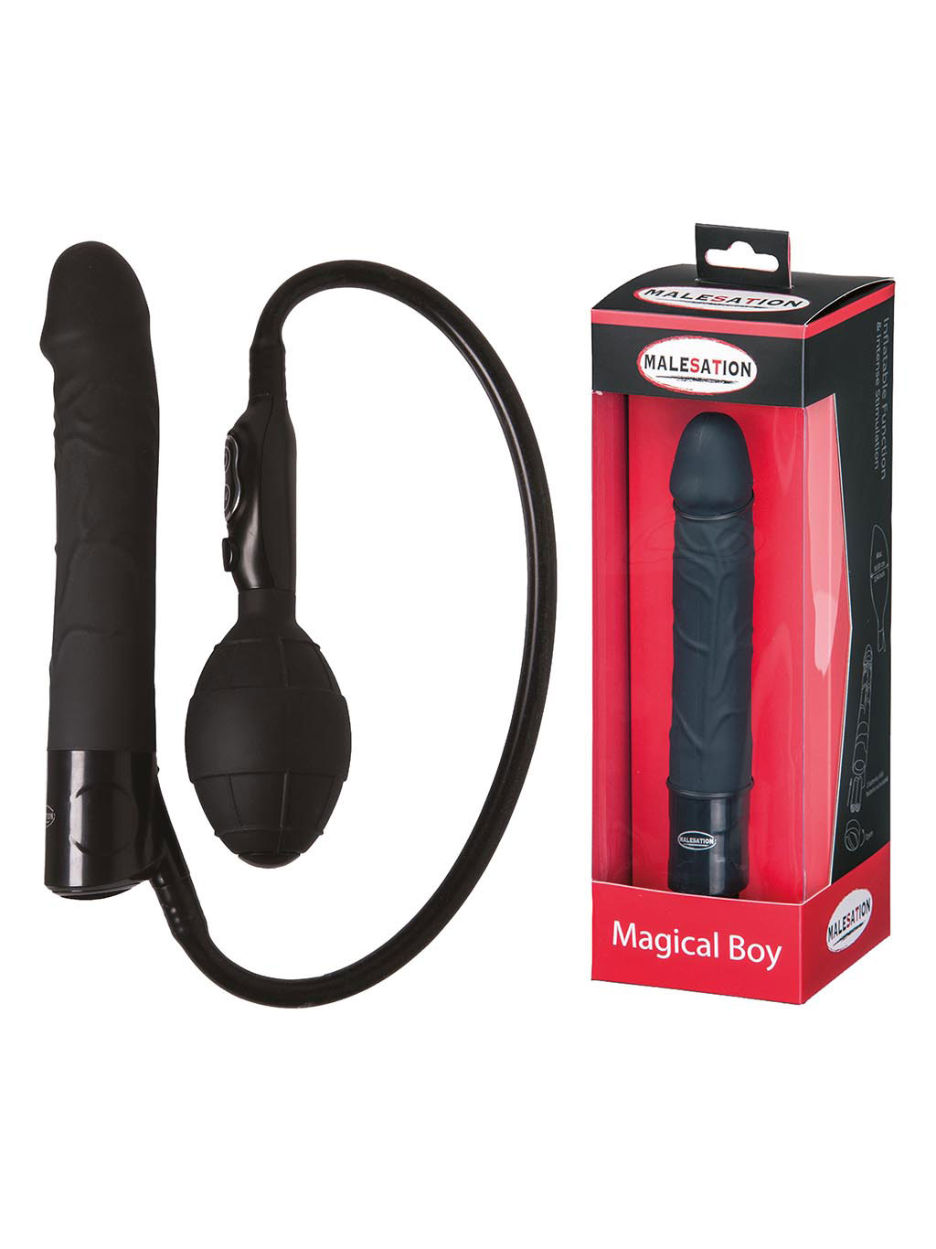 Inflatable vibrating penis with air release and 7 powerful functions. waterproof. Expand to more than double the size. Made of silicone. TPE and ABS plastic. Requires 2 AAA batteries (not included). Length: approx. 15.5cm