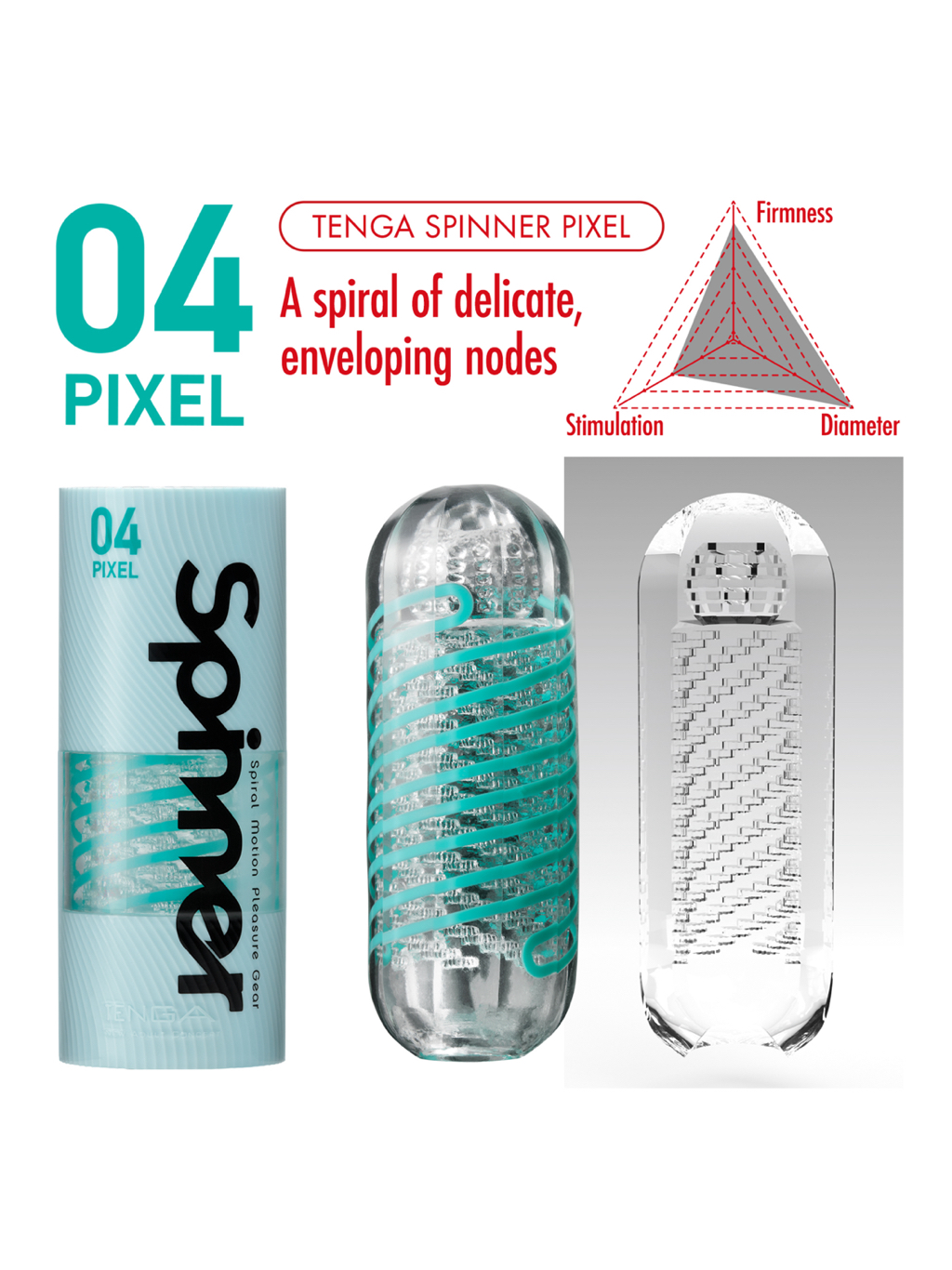 Go for a spin! Introducing the TENGA SPINNER! An all-new internal coil makes the SPINNER twist as you insert, sending unbelievable sensations with each stroke! Enjoy a unique sensation like none other. 04 PIXEL: A spiral of delicate, enveloping nodes